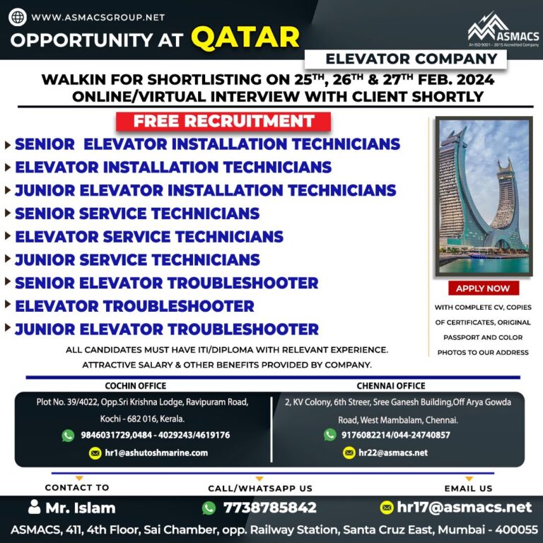 OPPORTUNITY AT QATARELEVATOR COMPANYWALKIN FOR SHORTLISTING ON 25TH, 26TH & 27TH FEB. 2024ONLINE/VIRTUAL INTERVIEW WITH CLIENT SHORTLYFREE RECRUITMENT► SENIOR ELEVATOR …