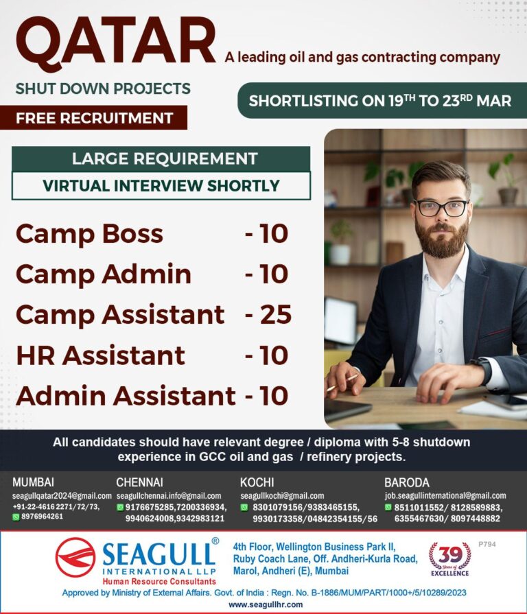 QATARSHUT DOWN PROJECTSFREE RECRUITMENTA leading oil and gas contracting companySHORTLISTING ON 19TH TO 23RD MARLARGE REQUIREMENTVIRTUAL INTERVIEW SHORTLYCamp Boss 10Camp …