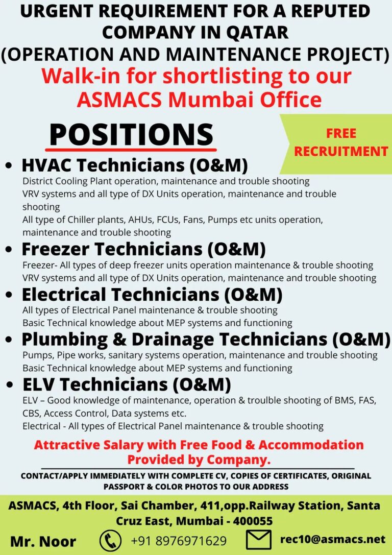 URGENT REQUIREMENT FOR A REPUTEDCOMPANY IN QATAR(OPERATION AND MAINTENANCE PROJECT)Walk-in for shortlisting to ourASMACS Mumbai OfficePOSITIONSFREERECRUITMENT• HVAC Technicians (O&M)District Cooling …