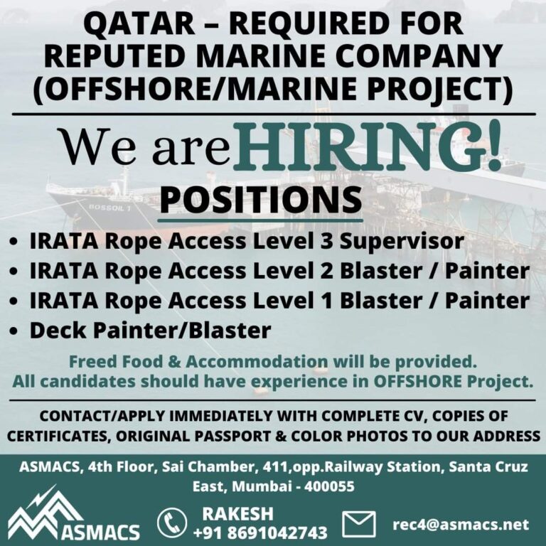 QATAR – REQUIRED FORREPUTED MARINE COMPANY(OFFSHORE/MARINE PROJECT)We areHIRING!BOSSOILPOSITIONS• IRATA Rope Access Level 3 Supervisor• IRATA Rope Access Level 2 Blaster …