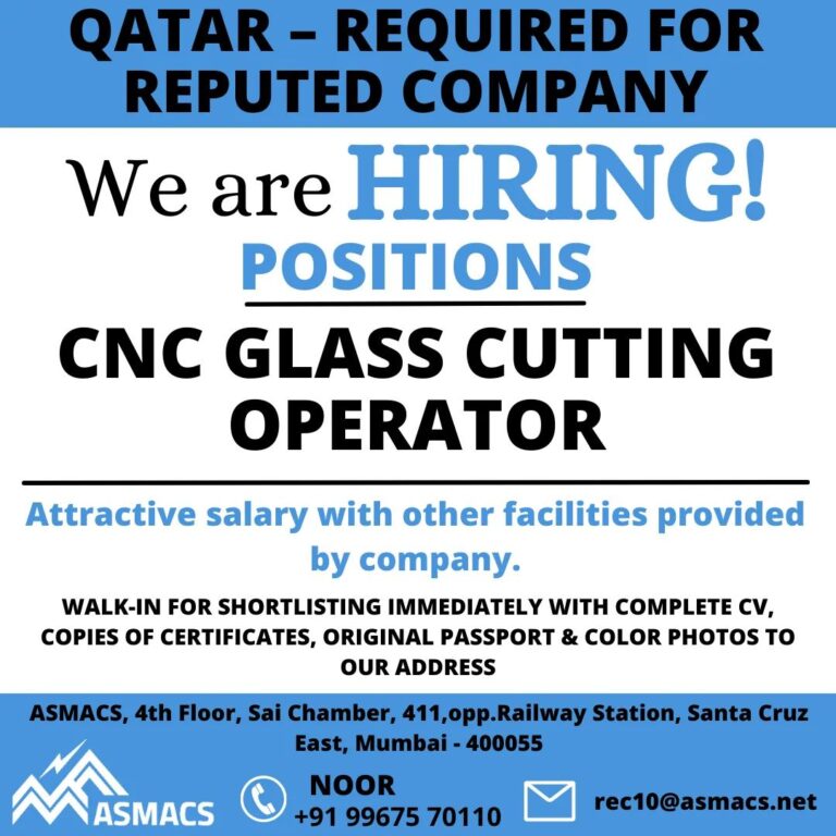 QATAR – REQUIRED FORREPUTED COMPANYWe are HIRING!POSITIONSCNC GLASS CUTTINGOPERATORAttractive salary with other facilities providedby company.WALK-IN FOR SHORTLISTING IMMEDIATELY WITH COMPLETE …