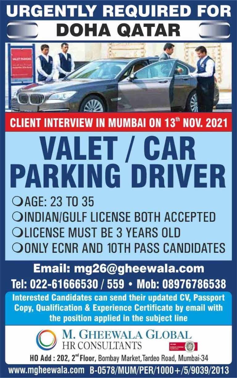 URGENTLY REQUIRED FOR DOHA QATARCLIENT INTERVIEW IN MUMBAI ON 13th NOV. 2021VALET / CARPARKING DRIVEROAGE: 23 TO 35OINDIANIGULF LICENSE BOTH …