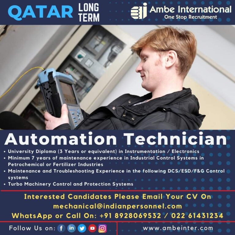 QATAR LONG TERMOne Stop RecruitmentAutomation TechnicianUniversity Diploma (3 Years or equivalent) in Instrumentation / ElectronicsMinimum 7 years of maintenance experience …