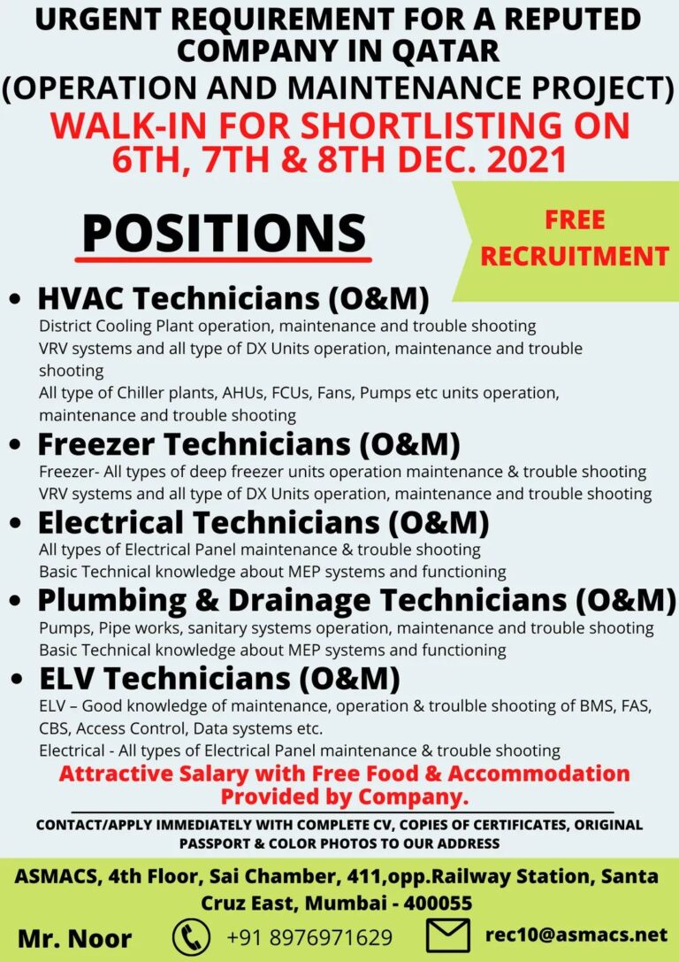 URGENT REQUIREMENT FOR A REPUTEDCOMPANY IN QATAR(OPERATION AND MAINTENANCE PROJECT)WALK-IN FOR SHORTLISTING ON6TH, ZTH & 8TH DEC. 2021POSITIONSFREERECRUITMENT• HVAC Technicians …
