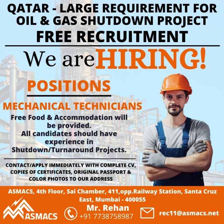 QATAR – LARGE REQUIREMENT FOROIL & GAS SHUTDOWN PROJECTFREE RECRUITMENTWe are HIRING!POSITIONSMECHANICAL TECHNICIANSFree Food & Accommodation willbe provided.All candidates should …