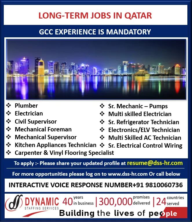 LONG-TERM JOBS IN QATARGCC EXPERIENCE IS MANDATORY PlumberSr. Mechanic – Pumps ElectricianMulti skilled ElectricianCivil SupervisorSr. Refrigerator TechnicianMechanical ForemanElectronics/ELV Technician Mechanical …