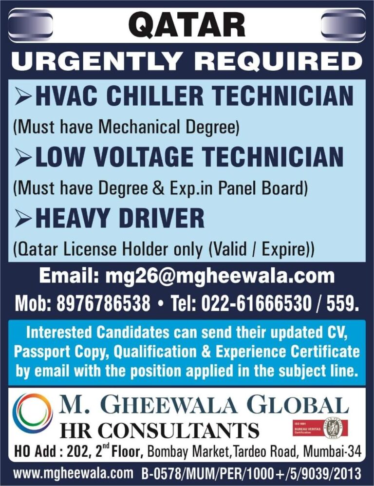 QATARURGENTLY REQUIREDHVAC CHILLER TECHNICIAN(Must have Mechanical Degree)LOW VOLTAGE TECHNICIAN(Must have Degree & Exp.in Panel Board)HEAVY DRIVER(Qatar License Holder only (Valid …