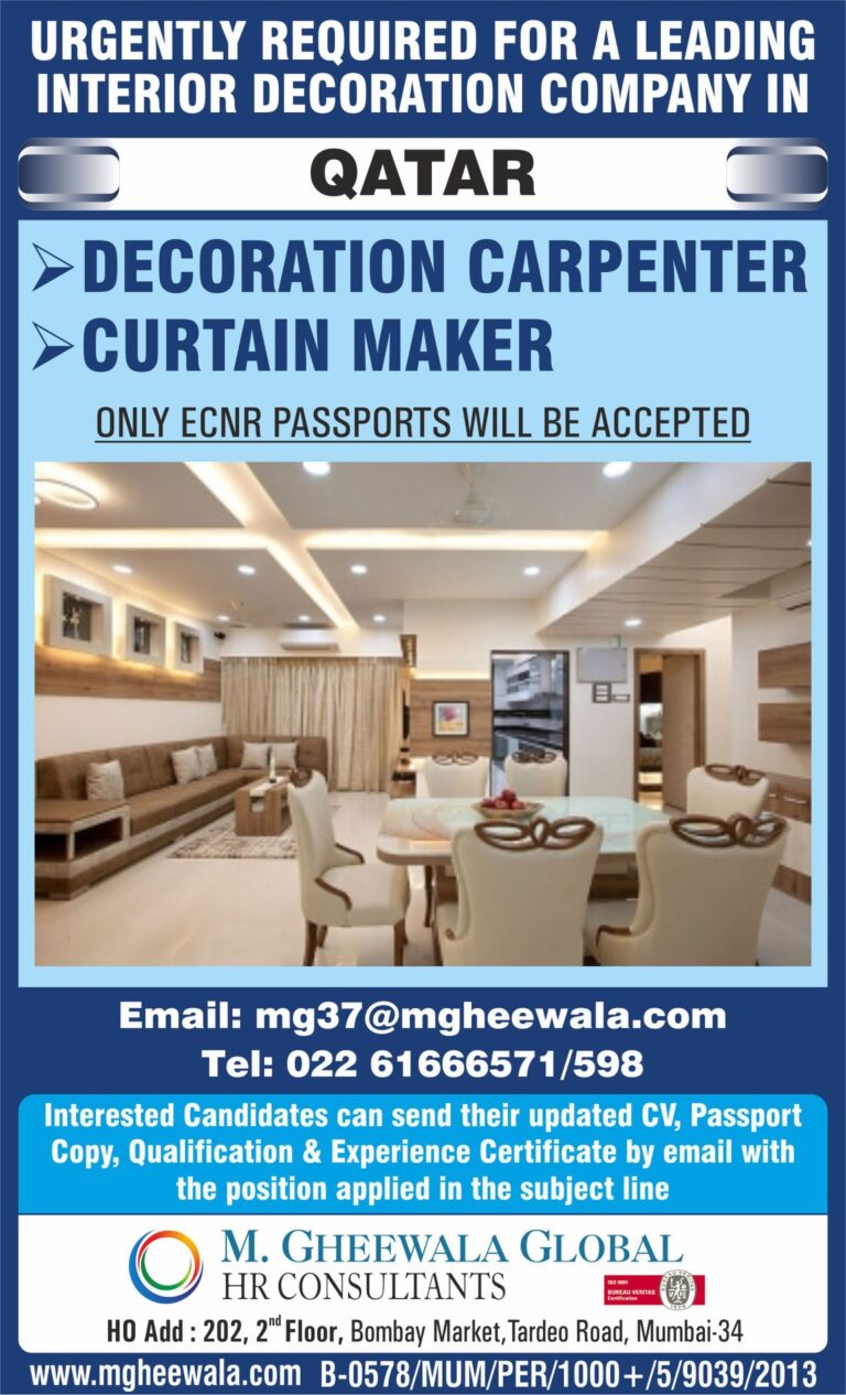 URGENTLY REQUIRED FOR A LEADINGINTERIOR DECORATION COMPANY INQATAR► DECORATION CARPENTERCURTAIN MAKERONLY ECNR PASSPORTS WILL BE ACCEPTEDE.Email: mg37@mgheewala.comTel: 022 61666571/598Interested candidates …