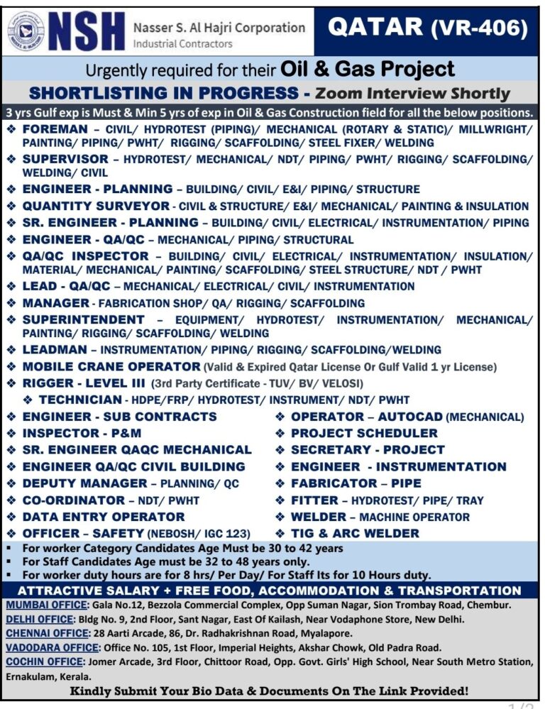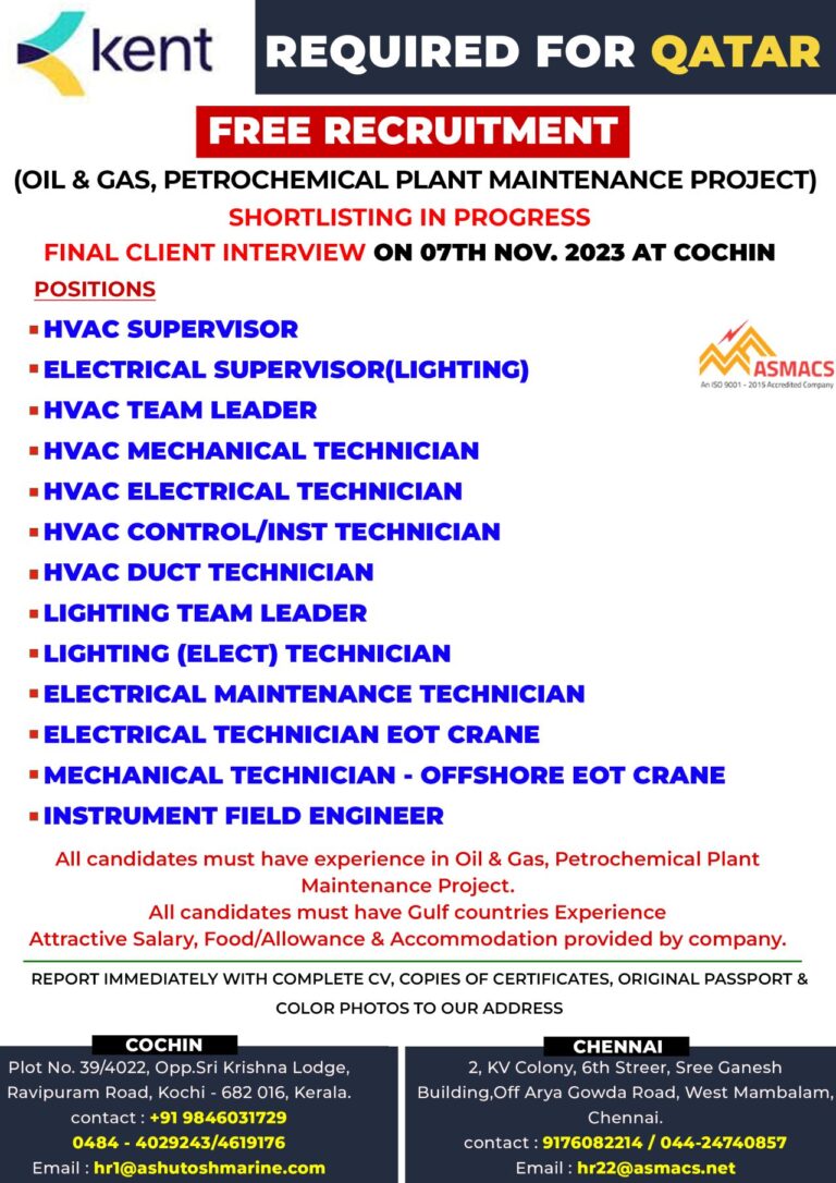 REQUIRED FOR QATARFREE RECRUITMENT(OIL & GAS, PETROCHEMICAL PLANT MAINTENANCE PROJECT)SHORTLISTING IN PROGRESSFINAL CLIENT INTERVIEW ON 07TH NOV. 2023 AT COCHINPOSITIONS▪ …