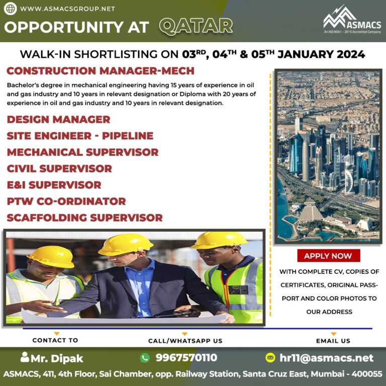 OPPORTUNITY AT QATARWALK-IN SHORTLISTING ON 03RD, 04TH & 05TH JANUARY 2024CONSTRUCTION MANAGER-MECHBachelor’s degree in mechanical engineering having 15 years of …