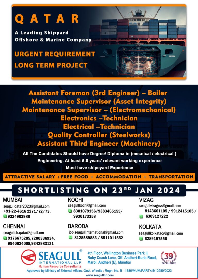 QATARA Leading ShipyardOffshore & Marine CompanyURGENT REQUIREMENTLONG TERM PROJECTAssistant Foreman (3rd Engineer) – BoilerMaintenance Supervisor (Asset Integrity)Maintenance Supervisor – (Electromechanical)Electronics …