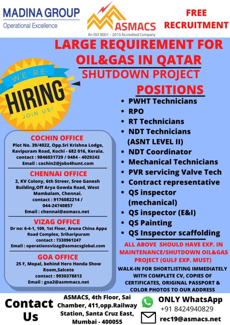 LARGE REQUIREMENT FOROIL&GAS IN QATARSHUTDOWN PROJECTPOSITIONS• PWHT Technicians• RPO• RT Technicians• NDT TechniciansCOCHIN OFFICE(ASNT LEVEL II)Plot No. 39/4022, Opp.Sri Krishna …