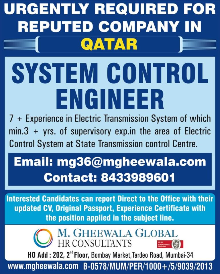 URGENTLY REQUIRED FORREPUTED COMPANY IN QATARSYSTEM CONTROLENGINEER7 + Experience in Electric Transmission System of whichmin.3 + yrs. of supervisory exp.in …