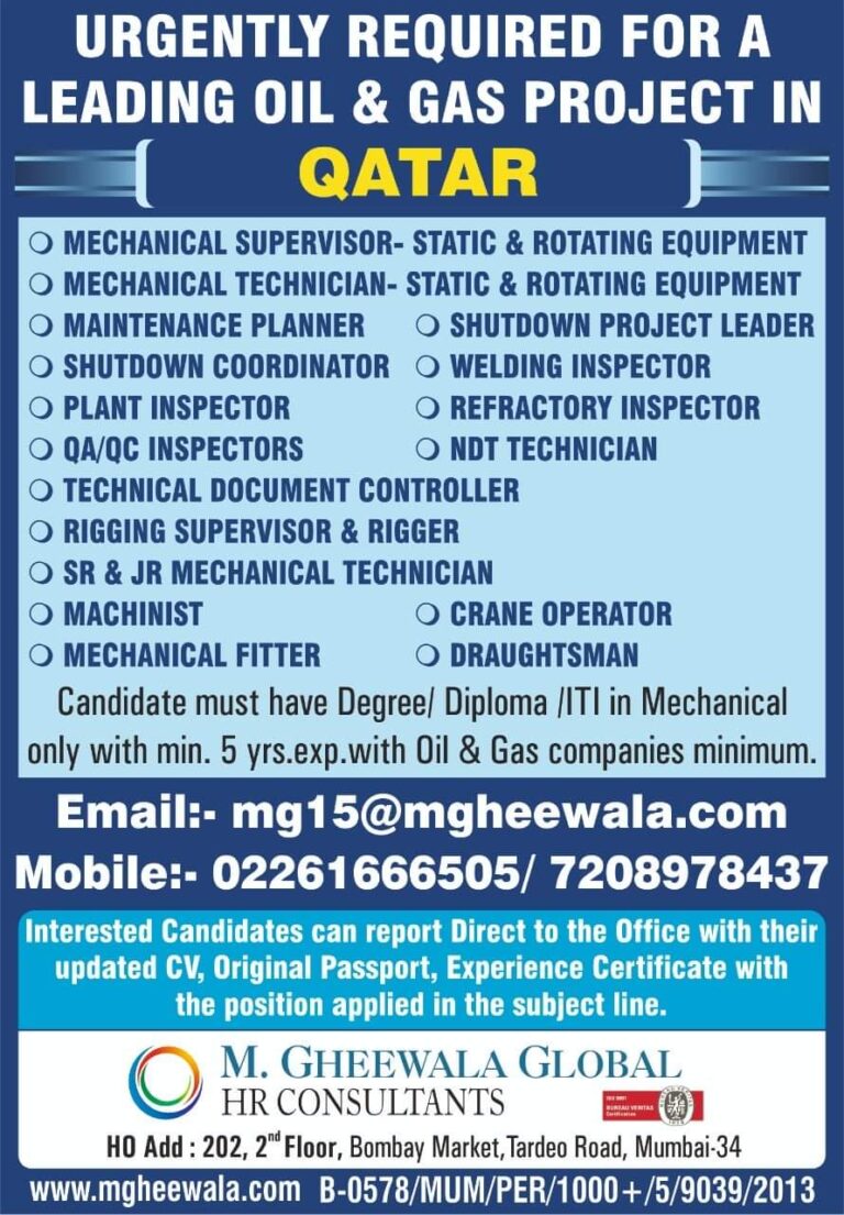 URGENTLY REQUIRED FOR ALEADING OIL & GAS PROJECT INQATARMECHANICAL SUPERVISOR-STATIC & ROTATING EQUIPMENTO MECHANICAL TECHNICIAN-STATIC & ROTATING EQUIPMENTO MAINTENANCE PLANNER …