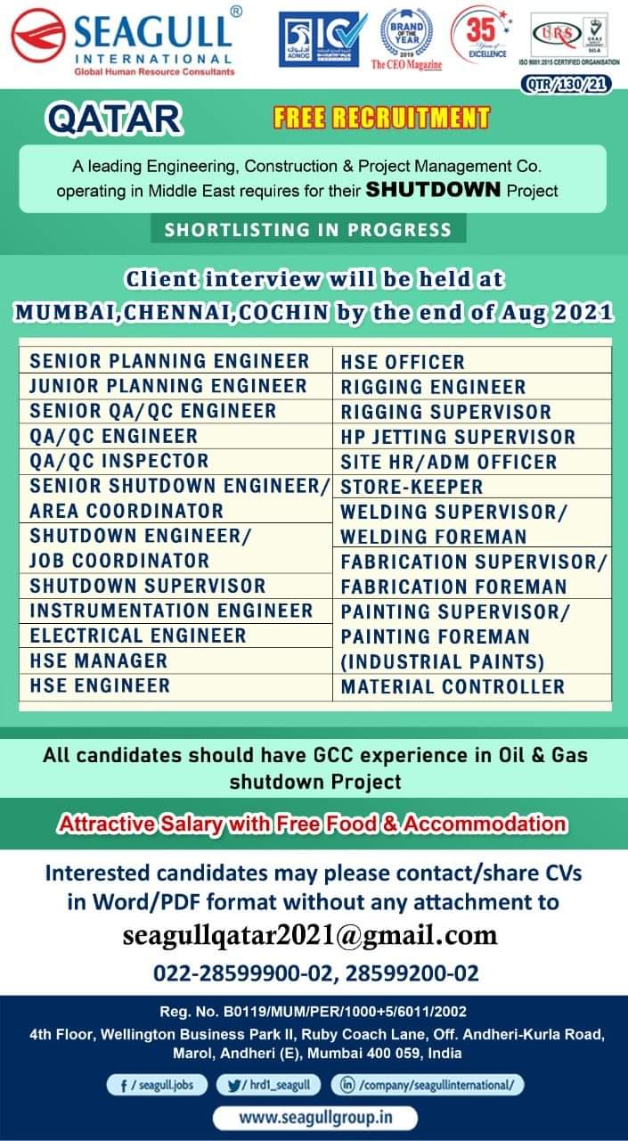 QATAR FREE RECRUITMENTA leading Engineering, Construction & Project Management Co.operating in Middle East requires for their SHUTDOWN ProjectSHORTLISTING IN PROGRESSClient …