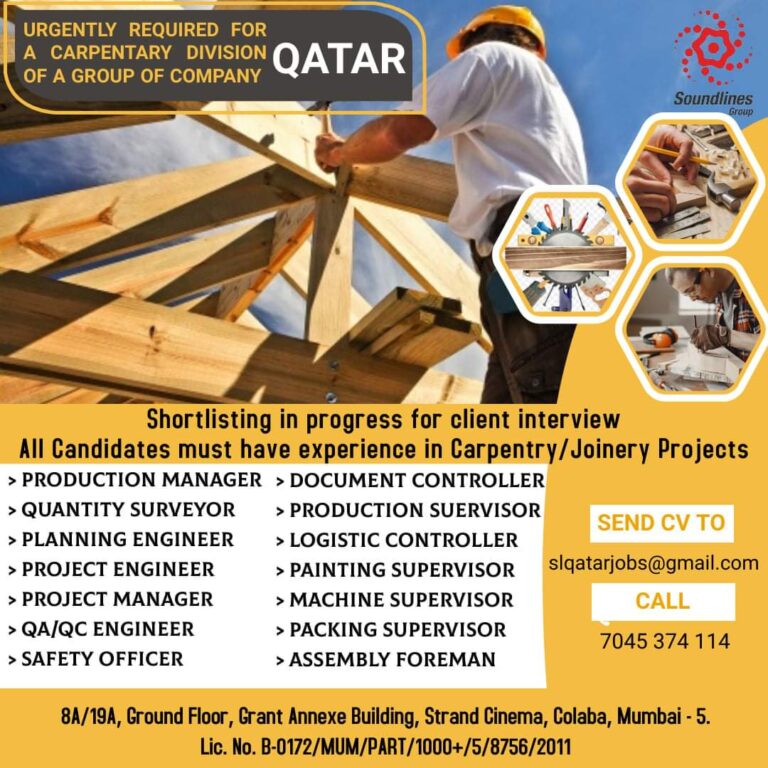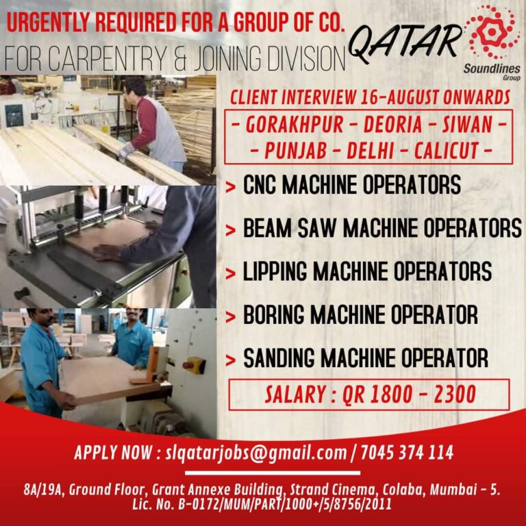 URGENTLY REQUIRED FOR A GROUP OF CO.FOR CARPENTRY & JOINING DIVISON QATAR OCLIENT INTERVIEW 16-AUGUST ONWARDS– GORAKHPUR – DEORIA – …