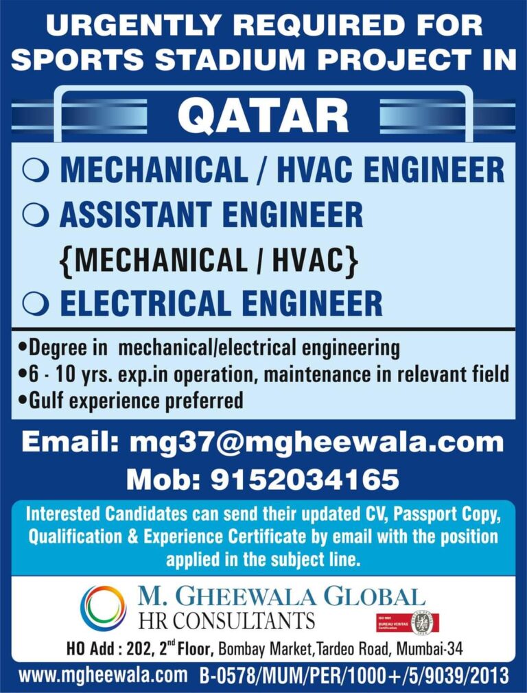 URGENTLY REQUIRED FORSPORTS STADIUM PROJECT INO MECHANICAL / HVAC ENGINEERO ASSISTANT ENGINEER{MECHANICAL | HVAC}O ELECTRICAL ENGINEER•Degree in mechanical/electrical engineering•6 – …
