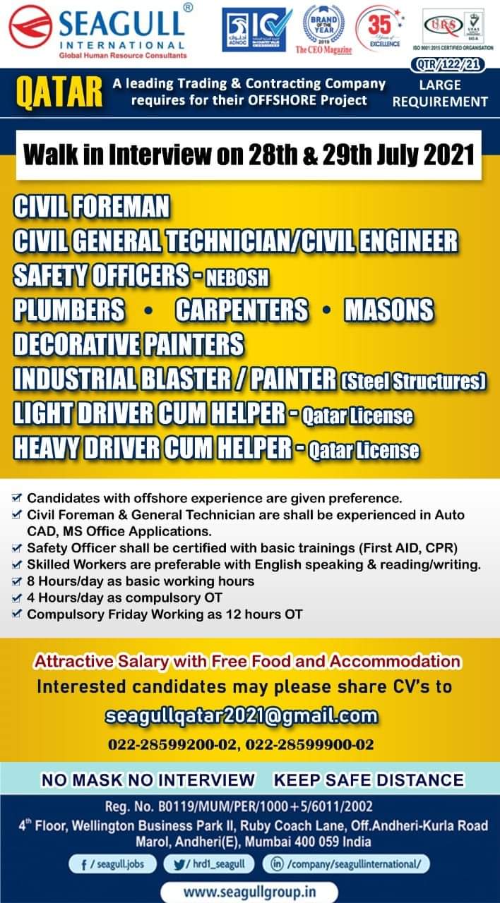 A leading Trading & Contracting Company LARGErequires for their OFFSHORE Project REQUIREMENTQATARWalk in Interview on 28th & 29th July 2021CIVIL …