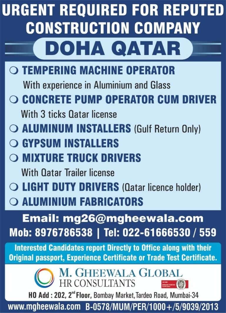 URGENT REQUIRED FOR REPUTEDCONSTRUCTION COMPANYDOHA QATARO TEMPERING MACHINE OPERATORWith experience in Aluminium and GlassO CONCRETE PUMP OPERATOR CUM DRIVERWith 3 …