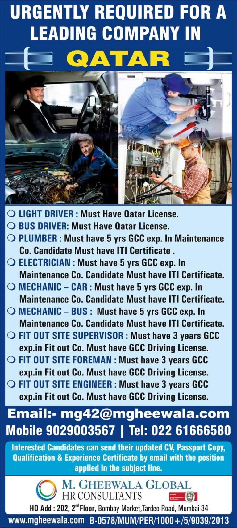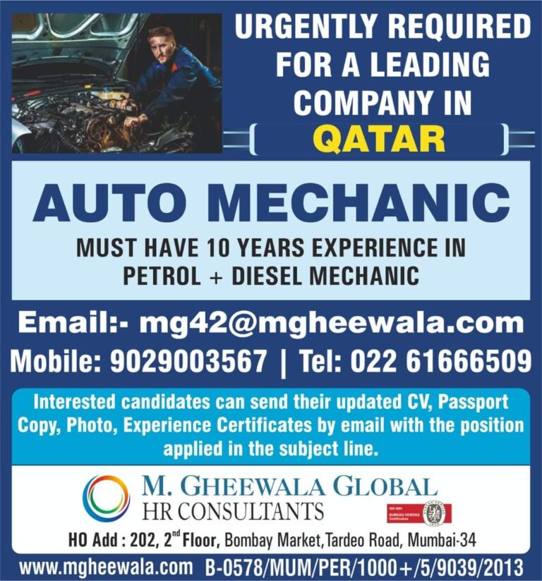 URGENTLY REQUIRED FOR A LEADING COMPANY IN QATARAUTO MECHANICMUST HAVE 10 YEARS EXPERIENCE INPETROL + DIESEL MECHANICEmail:- mg42@mgheewala.comMobile: 9029003567 | …