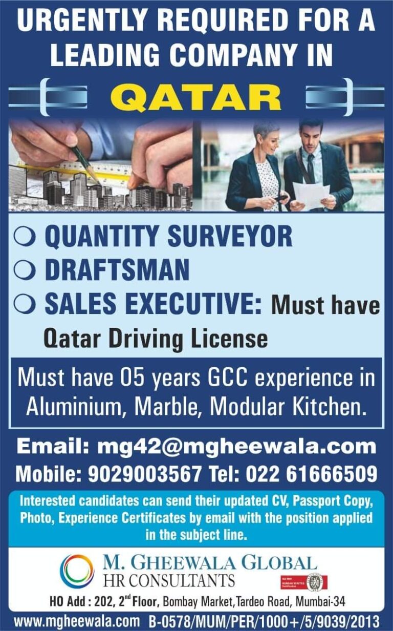 URGENTLY REQUIRED FOR ALEADING COMPANY INE QATAR .O QUANTITY SURVEYORO DRAFTSMANO SALES EXECUTIVE: Must haveQatar Driving LicenseMust have 05 years …