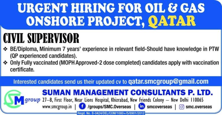 URGENT HIRING FOR OIL & GASONSHORE PROJECT, QATARCIVIL SUPERVISORBE/Diploma, Minimum 7 years’ experience in relevant field-Should have knowledge in PTW(QP …