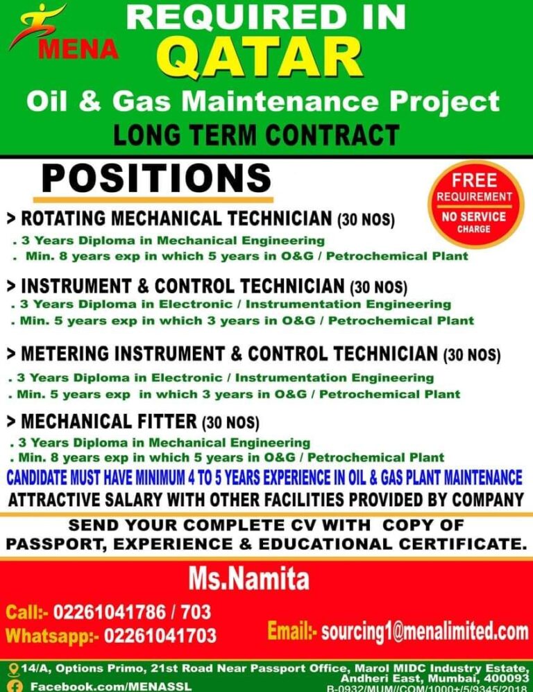 REQUIRED IN MENA QATAROil & Gas Maintenance ProjectLONG TERM CONTRACTPOSITIONSFREE ROTATING MECHANICAL TECHNICIAN (30 NOS)REQUIREMENTNO SERVICECHARGE. 3 Years Diploma in …
