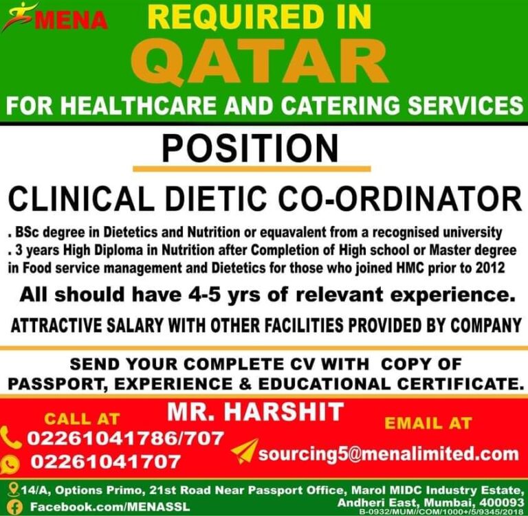 REQUIRED IN QATARFOR HEALTHCARE AND CATERING SERVICESPOSITIONCLINICAL DIETIC CO-ORDINATOR. BSc degree in Dietetics and Nutrition or equavalent from a recognised …