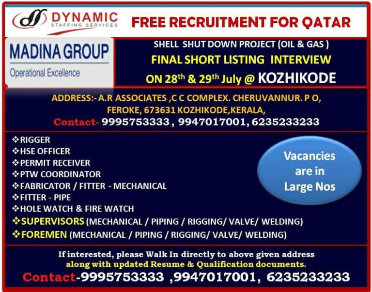 FREE RECRUITMENT FOR QATARSHELL SHUT DOWN PROJECT (OIL & GAS)MADINA GROUPFINAL SHORT LISTING INTERVIEWOperational ExcellenceON 28th & 29th July @ …