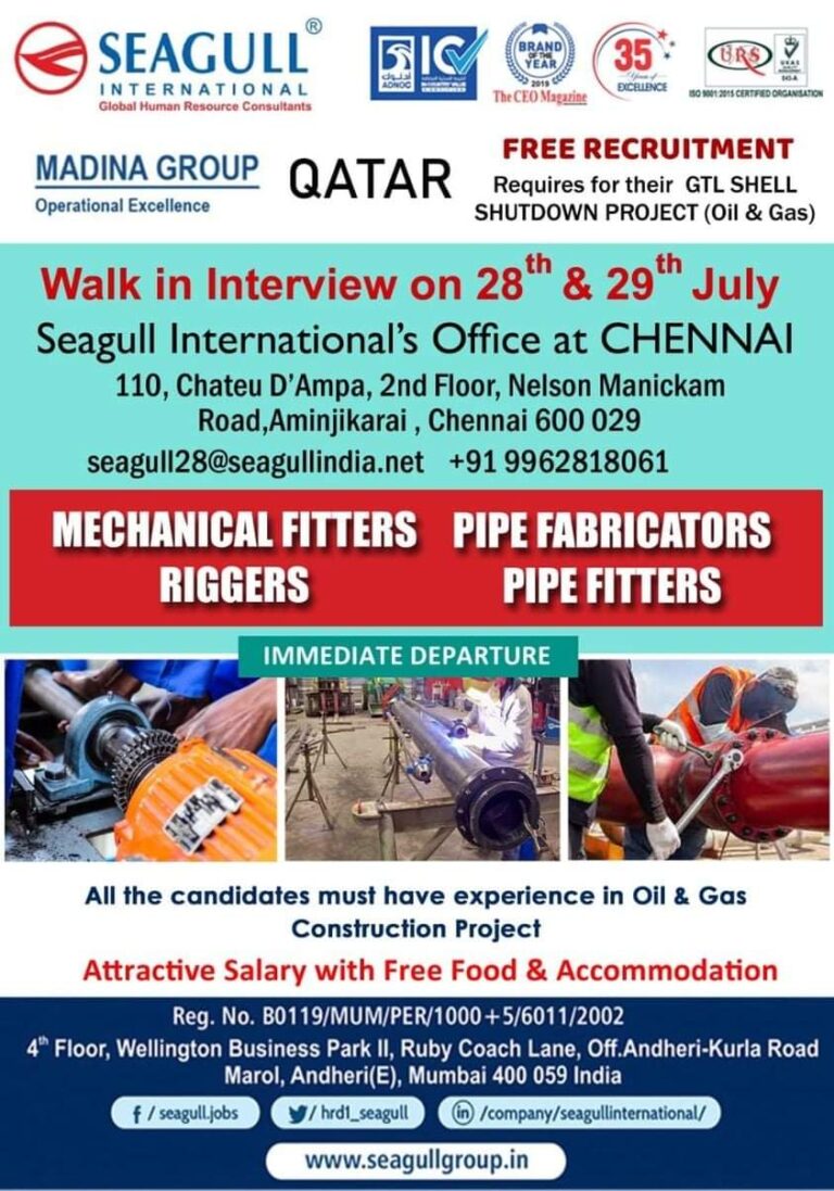 MADINA GROUP QATARFREE RECRUITMENTRequires for their GTL SHELLSHUTDOWN PROJECT (Oil & Gas)Operational ExcellenceWalk in Interview on 28 & 29″ JulySeagull …