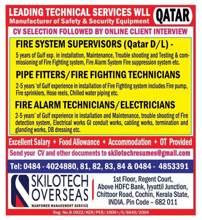 LEADING TECHNICAL SERVICES WLE QATARManufacturer of Safety & Security EquipmentCV SELECTION FOLLOWED BY ONLINE CLIENT INTERVIEWFIRE SYSTEM SUPERVISORS (Qatar D/L) …