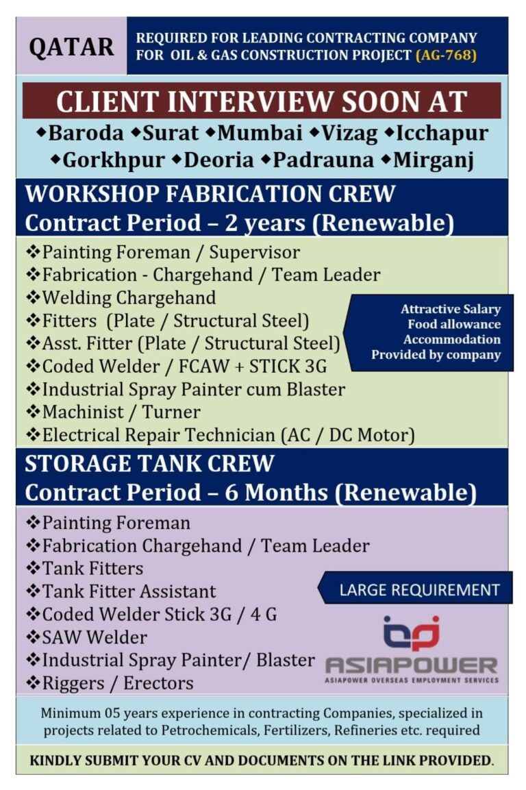 QATARREQUIRED FOR LEADING CONTRACTING COMPANYFOR OIL & GAS CONSTRUCTION PROJECT (AG-768)CLIENT INTERVIEW SOON AT•Baroda Surat Mumbai Vizag Icchapur•Gorkhpur •Deoria •Padrauna …