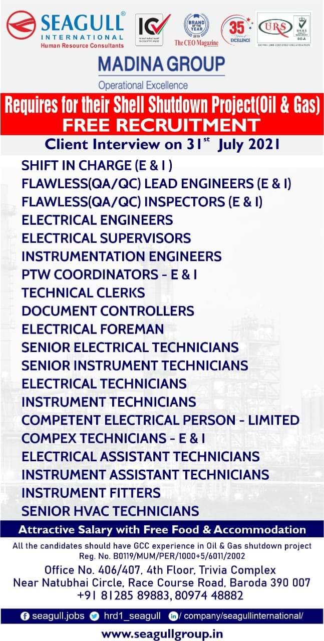 MADINA GROUPOperational ExcellenceRequires for their Shell Shutdown Project(Oil & Gas)FREE RECRUITMENTClient Interview on 315 July 2021SHIFT IN CHARGE (E&T)FLAWLESS(QA/QC) LEAD …