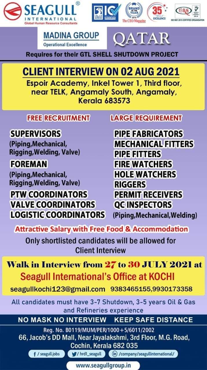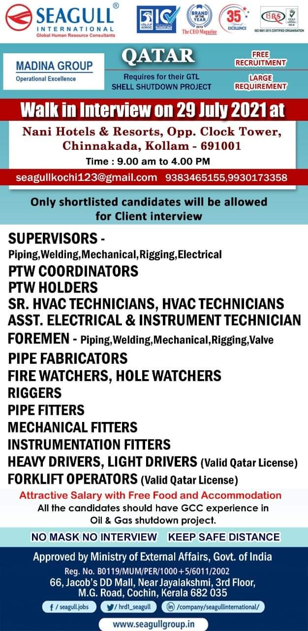 QATAR FREE RECRUITMENTMADINA GROUPOperational ExcellenceRequires for their GTLSHELL SHUTDOWN PROJECTLARGEREQUIREMENTWalk in Interview on 29 July 2021 atNani Hotels & Resorts, …