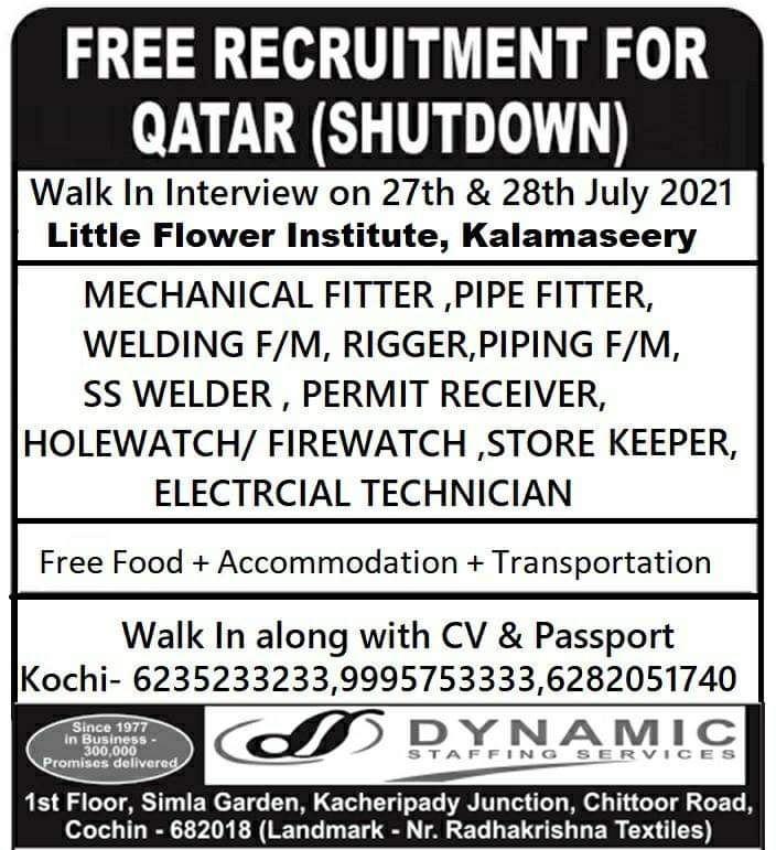 FREE RECRUITMENT FORQATAR (SHUTDOWN)Walk In Interview on 27th & 28th July 2021Little Flower Institute, KalamaseeryMECHANICAL FITTER ,PIPE FITTER,WELDING F/M, RIGGER,PIPING …