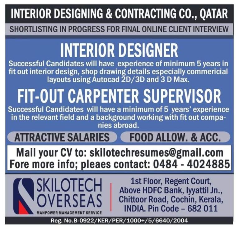 INTERIOR DESIGNING & CONTRACTING CO., QATARSHORTLISTING IN PROGRESS FOR FINAL ONLINE CLIENT INTERVIEWINTERIOR DESIGNERSuccessful Candidates will have experience of minimum …