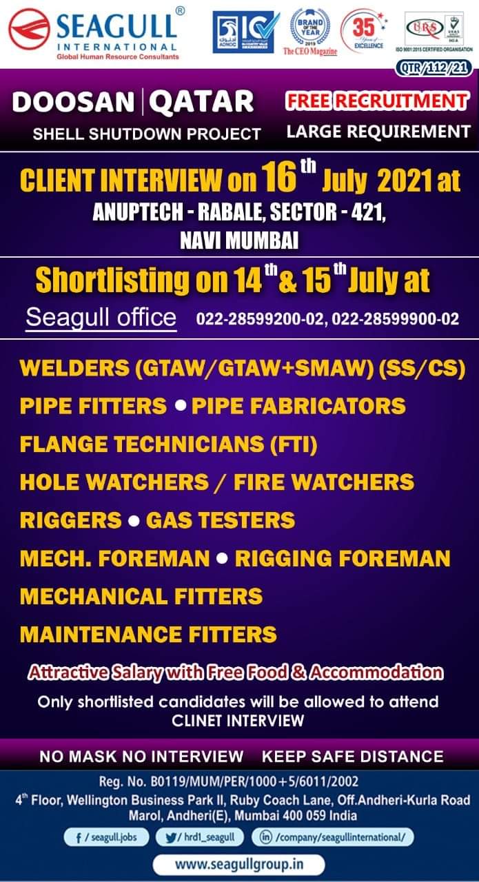 SHELL SHUTDOWN PROJECTDOOSAN QATAR FREE RECRUITMENTLARGE REQUIREMENTCLIENT INTERVIEW on 16th July 2021 atANUPTECH – RABALE, SECTOR – 421,NAVI MUMBAIShortlisting on …