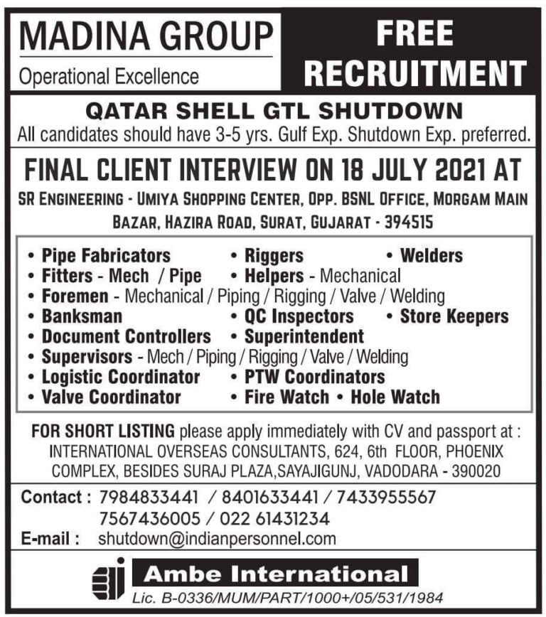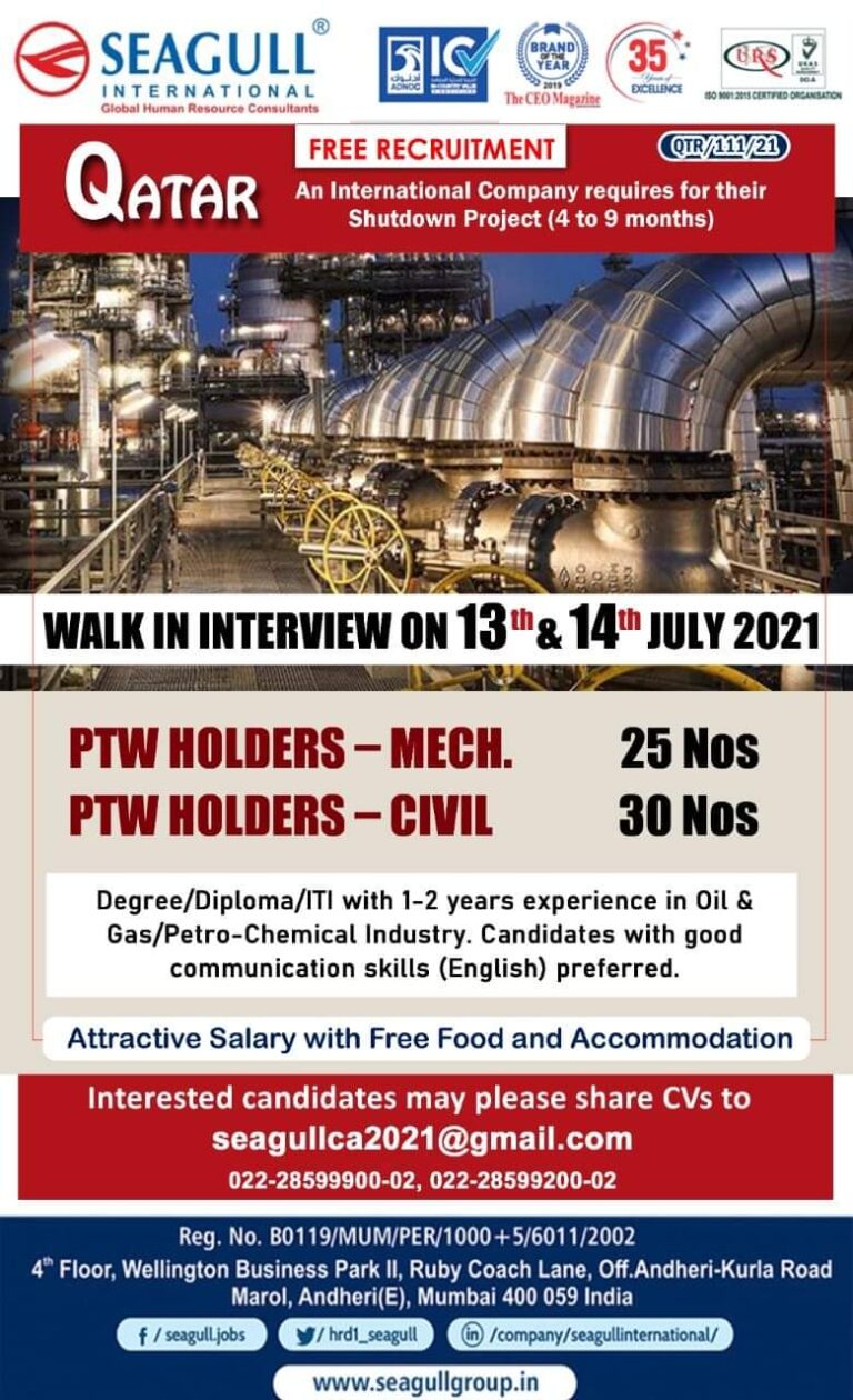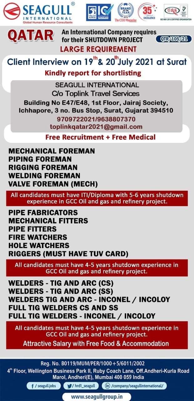 QATAR An International Company requiresfor their SHUTDOWN PROJECT QIR/105/21LARGE REQUIREMENTClient Interview on 19″& 20″July 2021 at SuratKindly report for shortlistingSEAGULL …