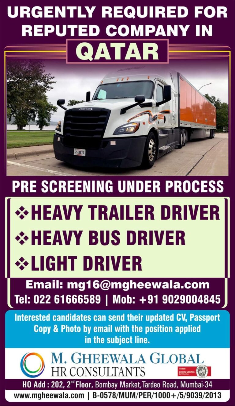 URGENTLY REQUIRED FORREPUTED COMPANY IN QATARPRE SCREENING UNDER PROCESSHEAVY TRAILER DRIVERHEAVY BUS DRIVERLIGHT DRIVEREmail: mg 16@mgheewala.comTel: 022 61666589 | Mob: …