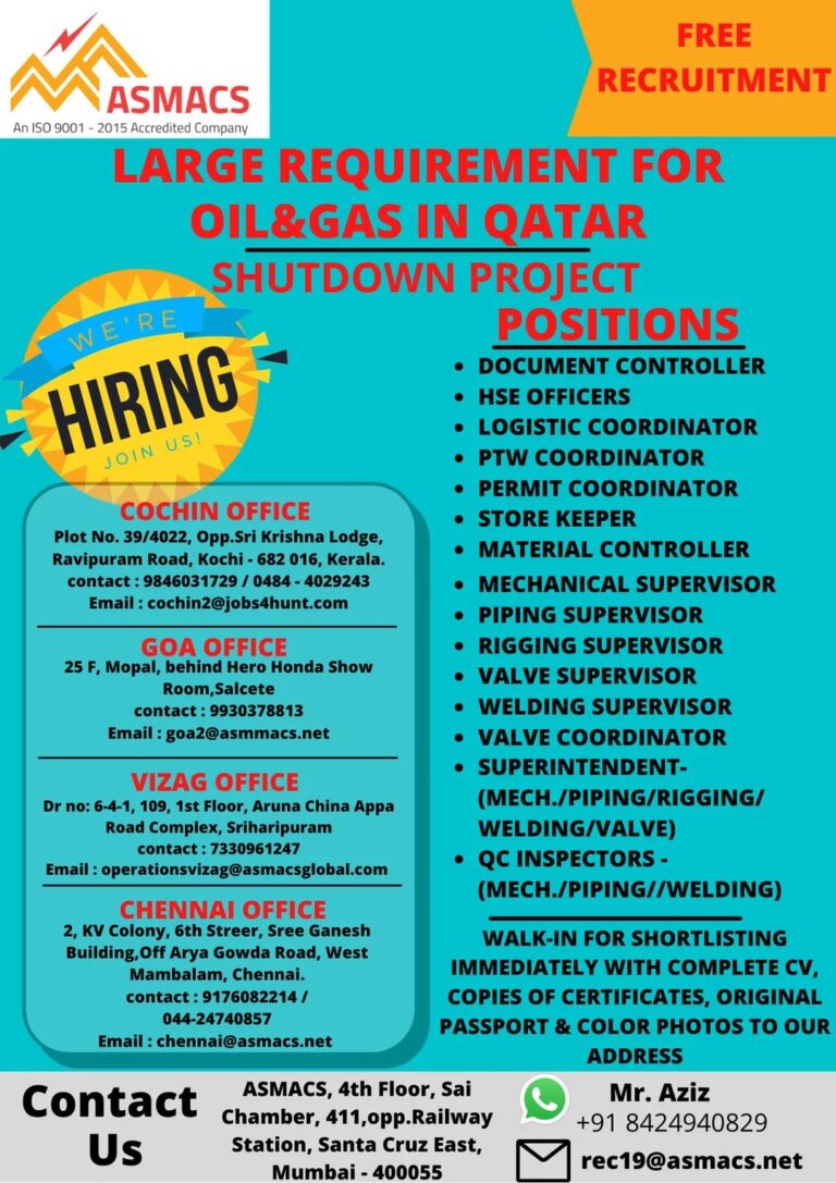 LARGE REQUIREMENT FOROIL&GAS IN QATARSHUTDOWN PROJECTWE’REPOSITIONS• FIRE WATCHHIRING• HOLE WATCHJOIN US!• MECHANICAL FOREMAN• PIPING FOREMANCOCHIN OFFICEPlot No. 39/4022, Opp.Sri Krishna …