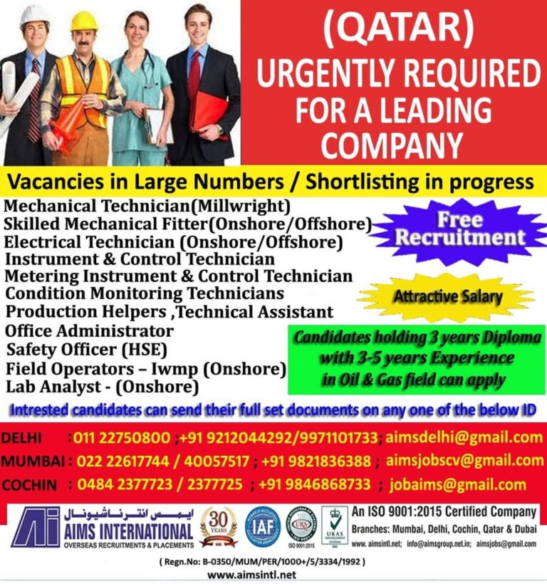 (QATAR)URGENTLY REQUIREDFOR A LEADINGCOMPANYVacancies in Large Numbers / Shortlisting in progressMechanical Technician(Millwright)Skilled Mechanical Fitter(Onshore/Offshore)FreeElectrical Technician (Onshore/Offshore)RecruitmentInstrument & Control TechnicianMetering Instrument …