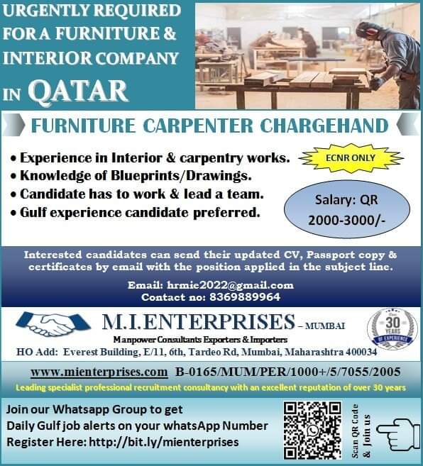 URGENTLY REQUIREDFORA FURNITURE & AINTERIOR COMPANYIN QATARFURNITURE CARPENTER CHARGEHANDECNR ONLY• Experience in Interior & carpentry works.• Knowledge of Blueprints/Drawings.• Candidate …