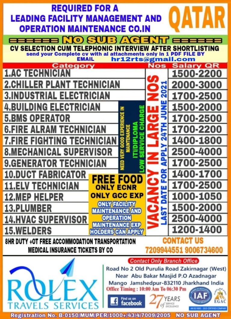 URGENT REQUIREDFOR MECHANICAL &ELECTRICAL CO. WLLQATARINTERVIEW MODE: TELEPHONIC / VIDEO CALLHVAC CONTROL TECHNICIAN – 3Education: Diploma in electrical / instrument …