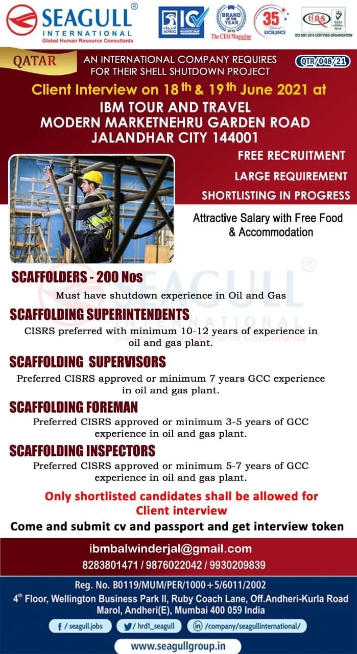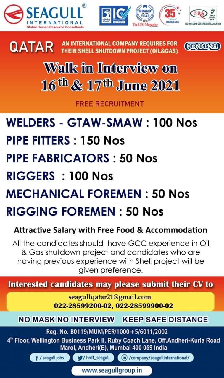 An International Company requires for theirPetro-Chemical/Oil & Gas Maintenance ProjectWalk in Interview on16th&1 thJune 2021 atSEAGULL INTERNATIONAL – MUMBAIseagullqtr2021@gmail.com022-28599900-02, 022-28599200-02SEAGULL …