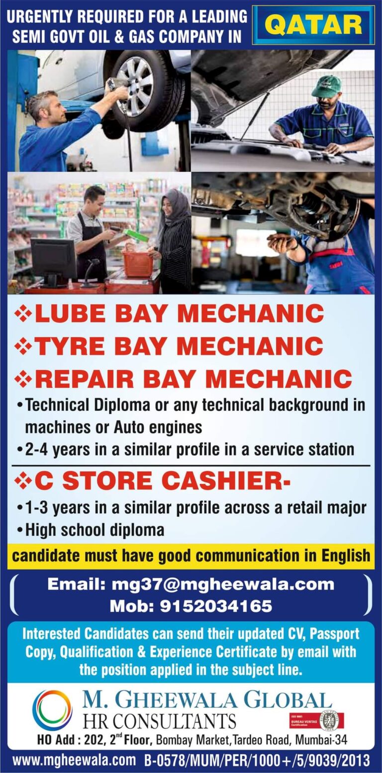 URGENTLY REQUIRED FOR A LEADINGSEMI GOVT OIL & GAS COMPANY INQATAR·LUBE BAY MECHANIC TYRE BAY MECHANICREPAIR BAY MECHANICTechnical Diploma or …