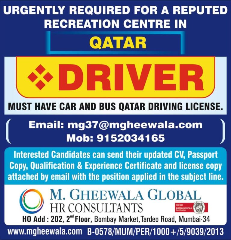 URGENTLY REQUIRED FOR A REPUTEDRECREATION CENTER INQATARDRIVERMUST HAVE CAR AND BUS QATAR DRIVING LICENSE.Email: mg37@mgheewala.comMob: 9152034165Interested candidates can send their …