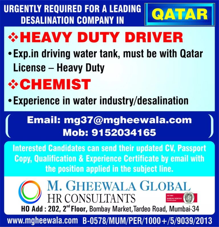 URGENTLY REQUIRED FOR A LEADINGQATARDESALINATION COMPANY IN*HEAVY DUTY DRIVER• Exp.in driving water tank, must be with QatarLicense – Heavy Duty*CHEMIST• …