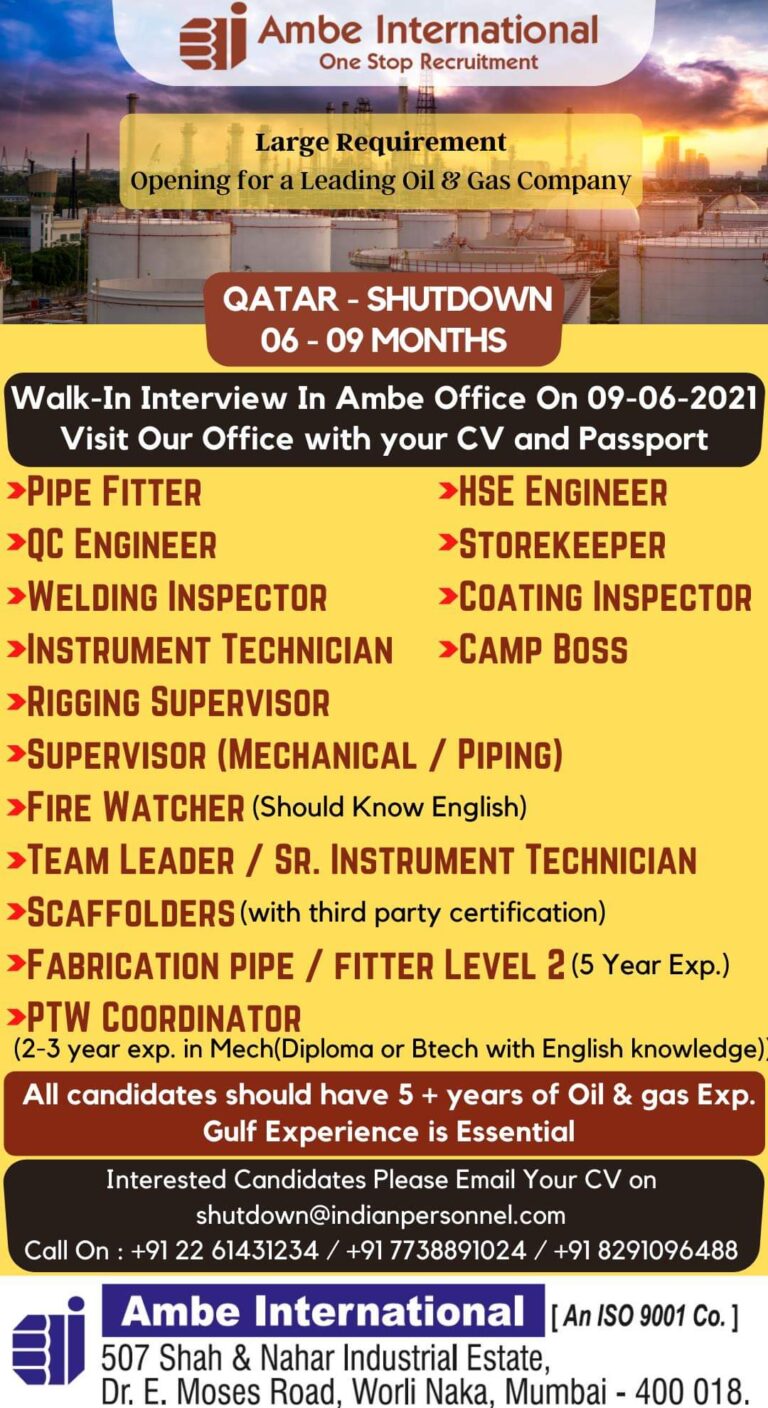 Large RequirementOpening for a Leading Oil 8 Gas CompanyQATAR – SHUTDOWN06 – 09 MONTHSWalk-ln Interview In Ambe Office On 09-06-2021Visit …