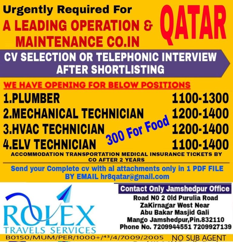 QATARUrgently Required ForA LEADING OPERATIONMAINTENANCE CO.INCV SELECTION OR TELEPHONIC INTERVIEWAFTER SHORTLISTINGWE HAVE OPENNO FOR BELOW POSXTON$I.PWMBER2.MECHANlCAL TECHNICIAN3.HVAC TECHNICIAN4.ELV TECHNICIANACCOMMODATION TRANSPORTATION …