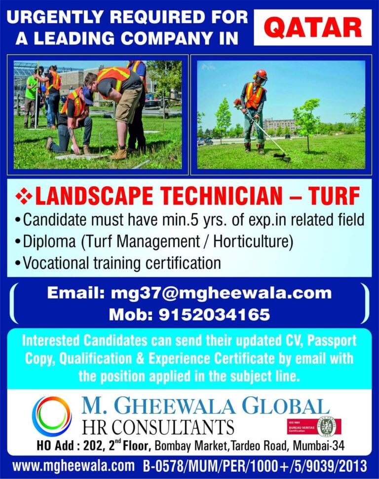 URGENTLY REQUIRED FORA LEADING COMPANY IN QATAR•LANDSCAPE TECHNICIAN – TURF• Candidate must have min.5 yrs. of exp.in related field•Diploma (Turf …
